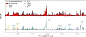 این تصویر طیف MIRI دیسک اطراف ستاره جوان GW Lup را در محدوده بین 13.5 تا 16.5 میکرون نشان می دهد. دانشمندان با مدلسازی محتوای شیمیایی، طیف اندازهگیری شده (پانل بالا، خط سیاه) را بازتولید کردند. مدل کل (پانل بالا، ناحیه قرمز) ترکیبی از مولکولها (پانل پایین) مانند دی اکسید کربن (CO2، سبز و بنفش)، آب (H2O، آبی)، سیانید هیدروژن (HCN، نارنجی)، هیدروکسیل (OH، صورتی)، و استیلن (C2H2، زرد). همچنین به طیف تعاملی در: https://www.mpia.de/scivis/gwlup مراجعه کنید. اعتبار: S. Grant و همکاران / MPIA