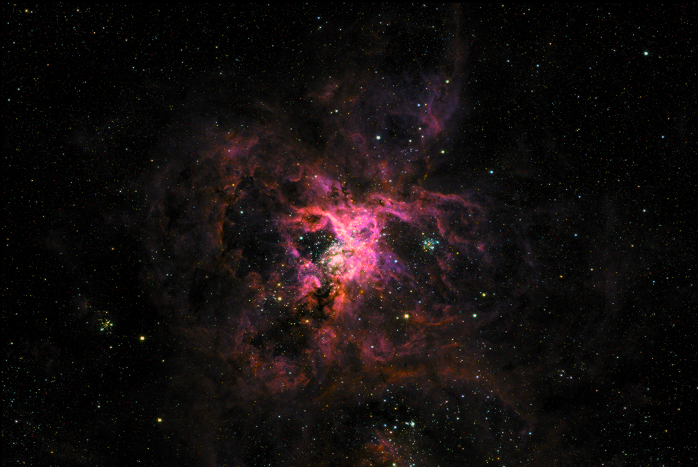 سحابی رتیل، هدف تلسکوپ فضایی جیمز وب و هابل در گذشته، در فاصله 160000 سال نوری از ما در ابر ماژلانی بزرگ، یک کهکشان اقماری مجاور کهکشان راه شیری قرار دارد. بخشهای صورتی روشن در این تصویر جدید از سحابی رتیل، غباری را نشان میدهد که در حال تشکیل ستارههای جوان است. در همین حال، لکههای آبی و زرد پراکنده در اطراف منطقه ستارههای مسنتری هستند.