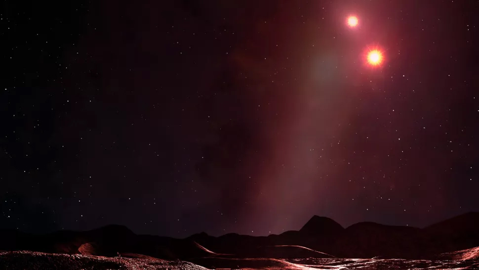 تصویری از یک سیاره دور، جهانی در مدار نه یک، بلکه دو ستاره که به دور مرکز جرم خود میچرخد. (اعتبار تصویر: مارک گارلیک/کتابخانه عکس علمی/گتی ایماژ)