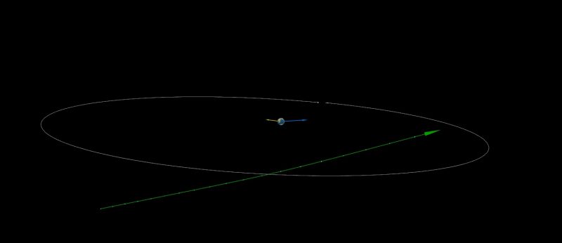 سیارک NT1 در 13 ژوئیه 2023 به اندازه 1/4 فاصله ماه از کنار زمین گذشت. زمین در مرکز این نمودار قرار دارد. مدار بیضی شکل مدار ماه و فلش سبز مسیر NT1 2023 را نشان می‌دهد. دانشمندان این سیارک را تا 15 جولای 2023 کشف نکردند، زیرا از جهت خورشید به زمین نزدیک شده بود. تصویر از IAU