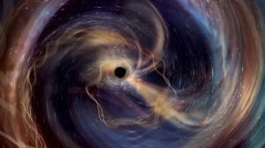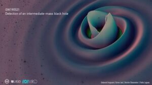 تصویری از GW250114، برخوردی قدرتمند بین دو سیاه‌چاله که امواج گرانشی ایجاد کرد که توسط LIGO مشاهده شده است که از یکی از سیاه‌چاله‌های درگیر دیده می‌شود. (اعتبار تصویر: Aurore Simonnet (SSU/EdEon)/LVK/URI)